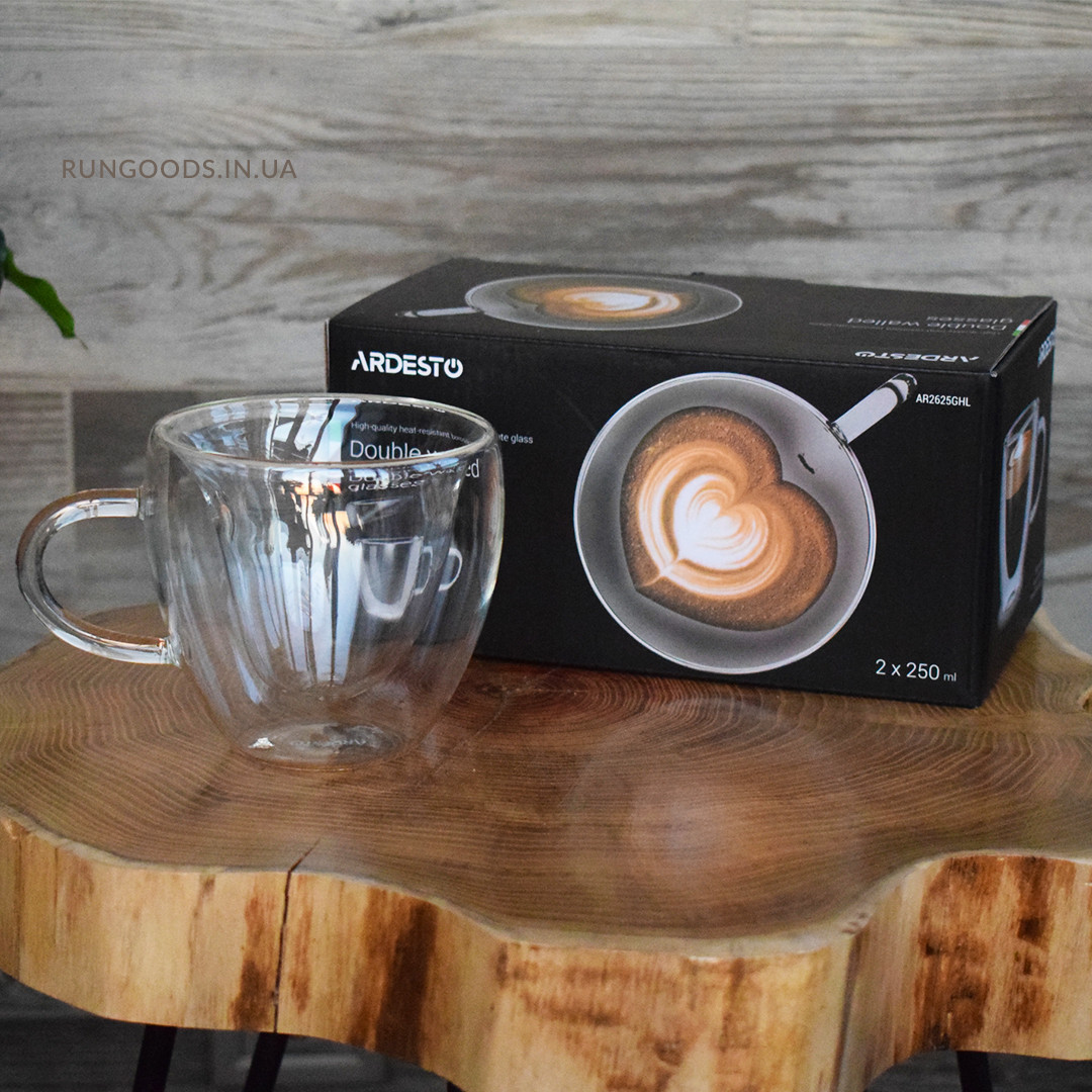 Набір з 2-х чашок ARDESTO з подвійними стінками у вигляді серця, виготовлені з боросилікатного скла, об'ємом 250мл. Країна виробник Китай. Не використовувати абразивні миючі засоби, які можуть пошкодити поверхню предмета. Не мити в посудомийній машині.
